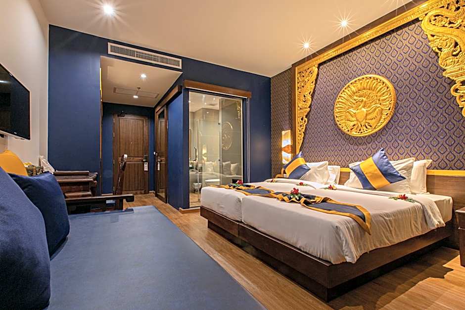 SUPERIOR ROYAL BLUE WING is 388 square feet and includes either a king-size bed 150-183 width or 2 single beds 80-130 width plus balcony, desk, cable tv, hairdryer, tea and coffee making facilities , safe, and slippers.